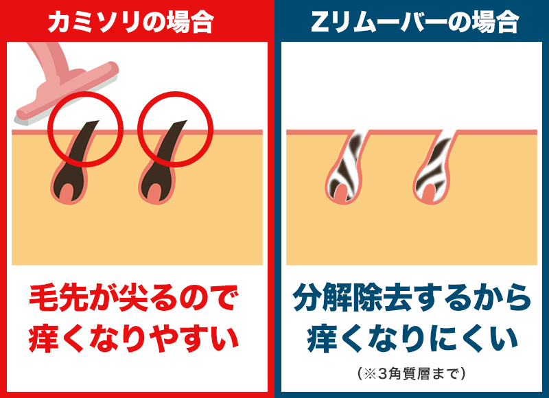 逆に、Zリムーバーで処理した毛は*根本から分解除去されるため、痒みを起こしにくいというわけですね。(*3角質層まで)
